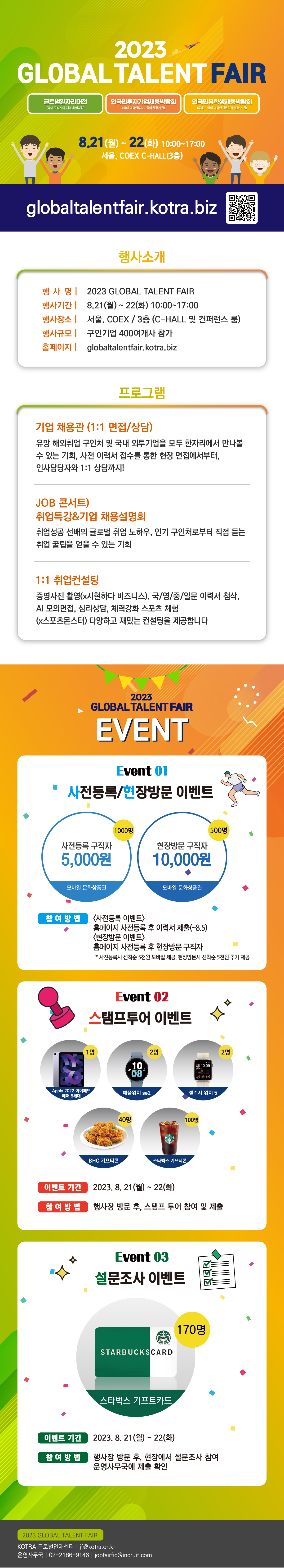 KOTRA는 국내 청년들의 해외취업 지원과 외국인투자기업의 우수 인재 확보를 위한 해외취업 지원 연계의 장으로 「2023 GLOBAL TALENT FAIR」를 개최할 계획입니다.